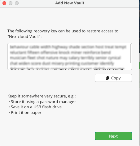 Das ist Deine Lebensversicherung, falls Du das Vault-Passwort einmal vergisst. Kopiere ihn und speichere ihn an einem sicheren Ort, zum Beispiel in den sicheren Notizen Deines Passwort-Managers. Speichere ihn nur nicht innerhalb von Nextcloud selbst.